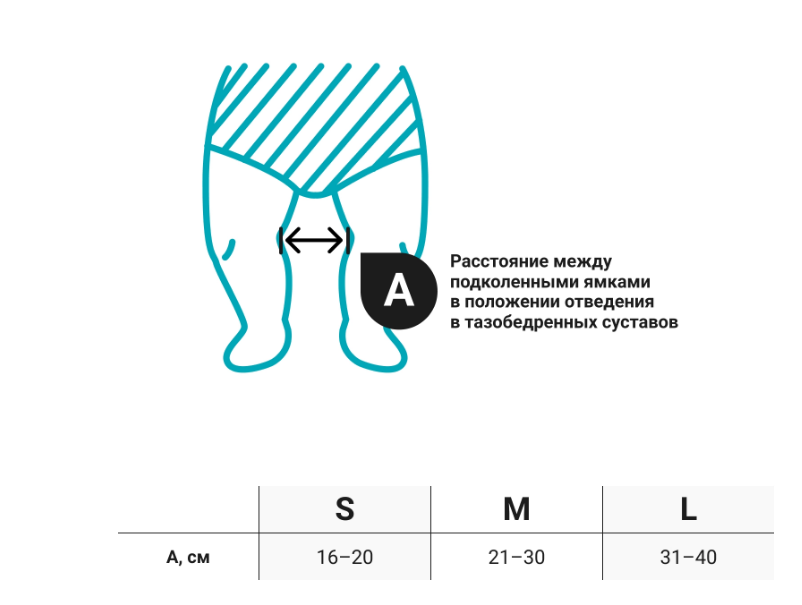 Для правильного выбора подходящего размера детского тазобедренного ортеза Orlett HFO-110 необходимо сантиметровой лентой измерить расстояние между подколенными ямками в положении отведения в тазобедренных суставах и воспользоваться таблицей: